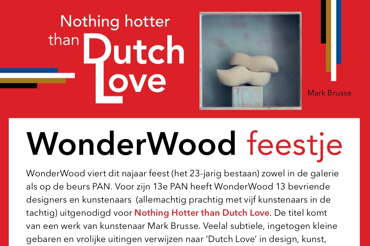 WonderWood is celebrating this autumn (the 23rd anniversary) in the gallery as well as at the PAN fair. For its 13th PAN, WonderWood has invited 13 designer and artist friends for Nothing Hotter than Dutch Love. The title comes from a work by artist Mark Brusse. Subtle, modest little gestures and cheerful expressions refer to ‘Dutch Love’ in design, art, photography, prints, glass and ceramics.